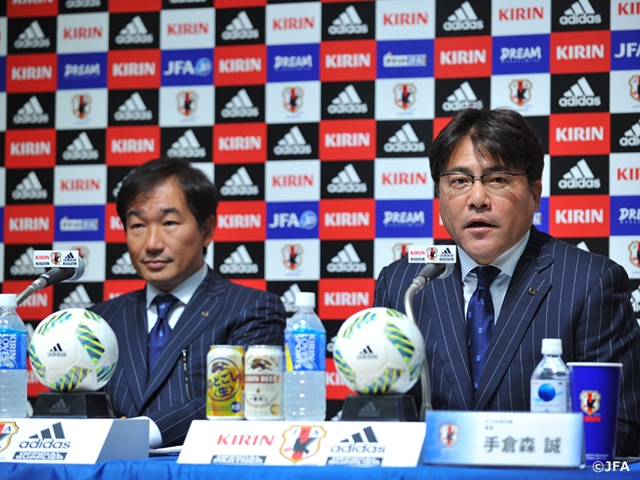 日本サッカー協会(JFA)は3月14日(月)、同月21日から30日までポルトガルに遠征するU-23日本代表のメンバー記者発表を行いました。霜田正浩JFA技術委員長(強化担当)と、手倉森誠U-23日本代表監督が登壇し、遠征に向けた抱負などを語りました。