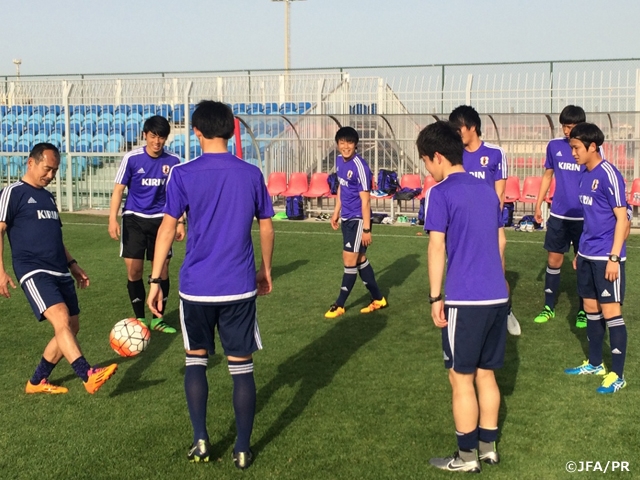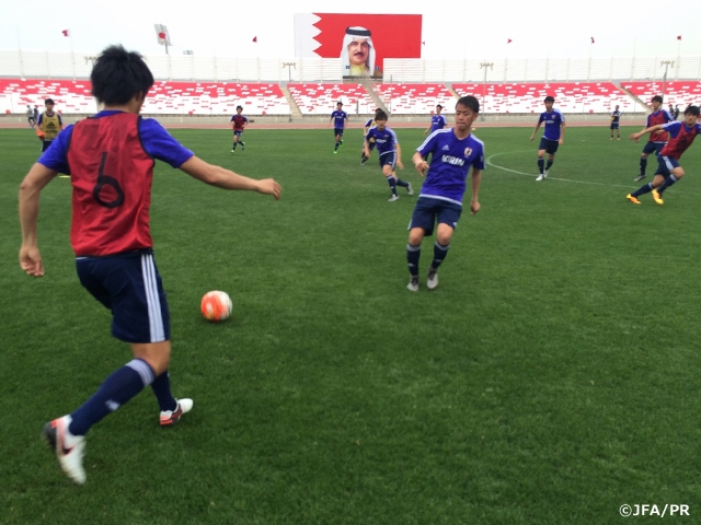 U-19日本代表がバーレーンU-19カップに出場するため、開催国バーレーンに入りトレーニングを行いました。バーレーンは、10月に行われるAFC U-19選手権2016の開催国でもあり、今回のトーナメントは選手権に向けたシミュレーション遠征にもなります。試合はAFC選手権と同じく中2日間で行われ、22日の初戦はマリ代表、第2戦は25日に開催国のバーレーン代表と対戦。そして最終戦は28日にメキシコ代表と試合を行い、各大陸の強豪国と3試合行います。初戦の2日前となる20日に到着した日本は、到着日は長時間移動の疲労から回復することに専念し、ランニング中心のメニューでトレーニングを終え、翌日は初戦のマリ代表戦に向けて38m×28mのコートで5vs5+フリーマンのパスゲームを行った後、選手間のコンビネーションを意識させるシュート練習を行いました。さらにセットプレーおよび試合中の守備時のポジションニングも確認。週末に行われたJリーグの兼ね合いもあり、チーム全員が集まるのは第1戦の当日となりますが、トレーニング以外でも選手間で積極的にコミュニケーションをとり、チーム間の共通理解を深めて、10月のAFC U-19選手権に向けて結果と内容にこだわった試合ができるようトーナメントに臨みます。