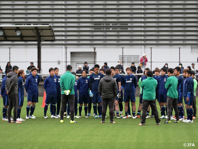 午後はピッチでの練習。肌寒い気候の中、まずは、5人組のパス&コントロールからポゼッションを。アジリティートレーニングを挟み、フォーメーションからフィニッシュまでの練習でコンビネーションの精度を高めると、最後は6対4+4対6+GKのゲーム形式の練習で締めくくります。初めて招集された5選手も高い理解力を示し、全員が攻守に連動したサッカーを展開し、手倉森監督が目指す「この年代全体でのレベルアップ」を体現していました。