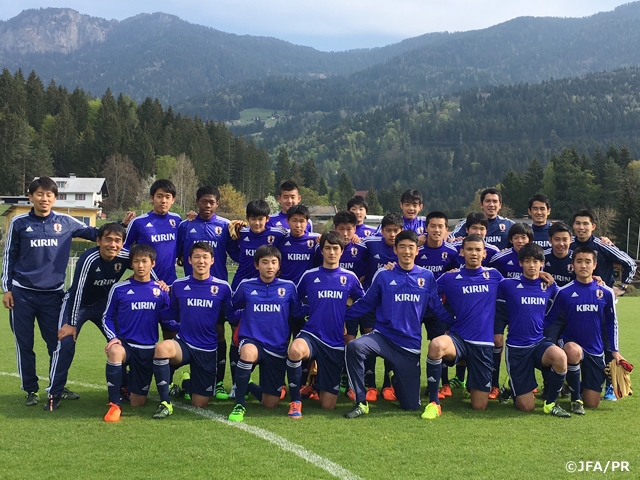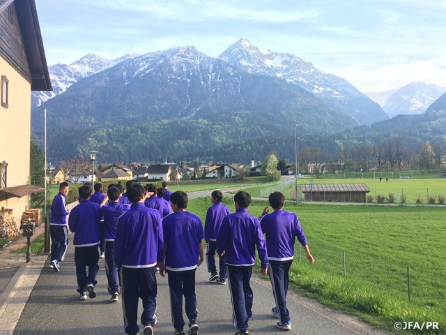 4月24日(日)から開幕する大会に向けて、U-15日本代表は4月21 日(木)夕方に会場となるオーストリアに無事に到着しました。早速ホテル周辺の散歩に出掛け、素晴らしい景色にスタッフ・選手はみな感動した様子で長旅の疲れも取れていきました。夜は池川直志ドクターより食事や体調管理、メディカル面の重要性について、中條智志トレーナーより日本代表育成年代で取り組んでいるフィジカルフィットネスの一つ、ムーブメントプレパレーションの動作確認をレクチャーしました。そして最後に、森山佳郎監督からチームコンセプトを改めて丁寧に説明し、欧州リーグの参考となるプレー集や「00ジャパン」*の良いシーンなどの映像を見ながら、チームが目指すべきプレーを共有しました。