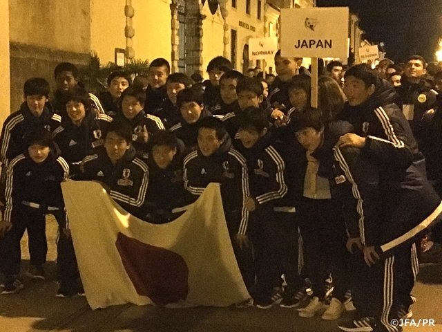 ハーフタイムに森山佳郎監督からの激しい檄が飛ぶと、選手たちは前半同様、後半立ち上がりから攻勢に出ます。そして37分、ゴール前でFKを得ると、素早いリスタートから途中出場のDF岩井龍翔司選手がクロスを上げます。小田選手のシュートが相手GKに防がれますが、山崎選手が押し込み同点ゴールを奪います。さらに攻め続ける日本は何度もシュートチャンスを作ります。47分、MF食野壮磨選手が左サイドでボールを受け、ドリブルで中央に入り込みシュートを放ちますが惜しくも外れます。さらに58分、DF熊田柊人選手の絶妙なクロスを栗原選手がヘッドで合わせますが、わずかに外れなかなか逆転ゴールを奪えません。それでも69分、食野選手が中央に出したパスを途中出場のFW西川潤選手が豪快に蹴りこみ遂に逆転ゴールを奪います。しかし、試合はまだ終わらず相手キックオフからずるずると攻めこまれ左サイドから崩されそのまま同点ゴールを許してしまいます。限られた時間内で、諦めない日本はアディショナルタイム2分、最後のチャンスでCKを獲得します。岩井選手のCKをDF西尾隆矢選手がヘッドで折り返し、最後は栗原選手が高い打点のヘッドで流し込み勝ち越しゴールを奪います。試合はそのまま4-3で終了し、劇的な展開で日本は初戦を勝利で飾りました。