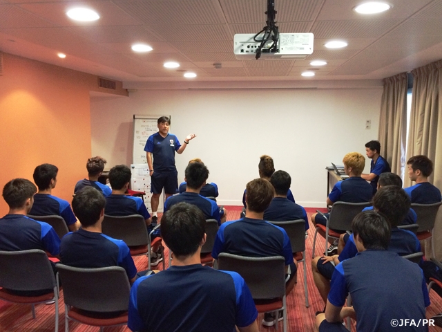 夕食後のミーティングでは、前日ギニアと戦ったパラグアイの映像を確認。オリンピックで対戦するコロンビアと同じ南米大陸のチームの特徴をしっかり分析しました。