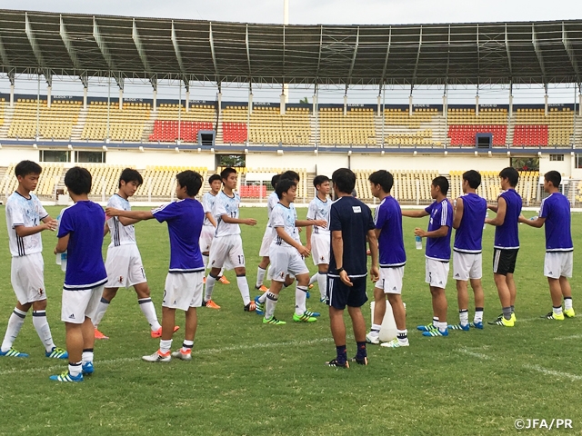 昨日同様、AFC U-16選手権インド2016で実際に開催されるスタジアムにて、夕方16時の試合開始時間に合わせてのシミュレーション試合となりました。 気温も高く日差しが残る時間帯での試合は、夜20時の試合とは異なる対応策が求められます。メンバーを大幅に変更し臨んだ日本は、前半から相手を圧倒します。