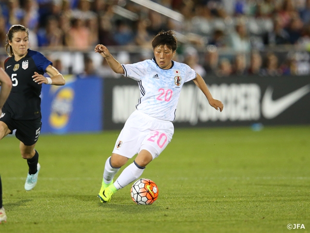 後半に入ると57分、大儀見選手がこの日2枚目のイエローカードで退場となり、日本は10人で試合を戦うことになりました。64分、アメリカはフリーキックから得点し、日本は同点に追いつかれます。その後佐々木選手に替わり、同じく国際Aマッチの初出場のMF中里優選手を投入。何とか攻撃の糸口を見つけようと試みますが、アメリカの攻撃の時間帯が続き、89分には左サイドからのクロスにリンジー・ホラン選手がヘディングで得点し、逆転を許してしまいます。しかし、アディショナルタイムに入った94分、阪口選手からのパスに抜けだした交代出場のFW横山久美選手がゴール。日本は3-3でアメリカ女子代表との第1戦を終えました。