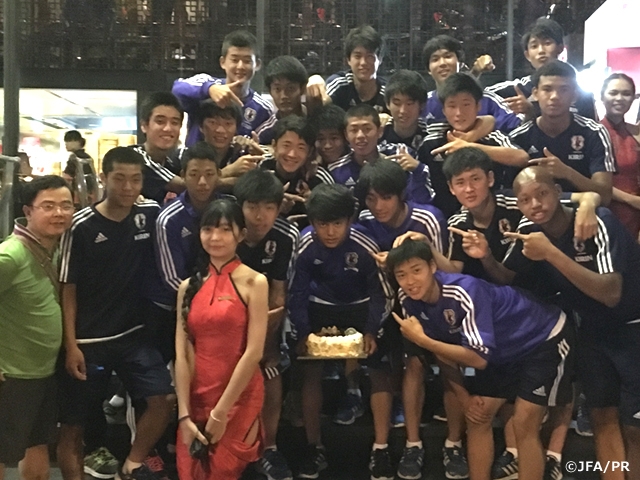 2回の乗り換えを含む約24時間の移動を経て4日の昼、チームはベトナム・ホーチミンのホテルに到着しました。7日に対戦するHoang Anh Gia Lai FC U-15チームの子どもたちが、疲れが吹き飛ぶほどの熱烈な歓迎をしてくれました。到着後、すぐにトレーニングを実施。移動の疲れもあり、中馬健太郎コンディショニングコーチの元、ボールを使用しないクールダウン中心のトレーニングを繰り返し行い、体調を整えていきました。夜にはこの日誕生日を迎えたFW久保建英選手を皆で祝い、サプライズあり、笑いあり、大いに盛り上がりました。5日はトレーニングを行い、6日からは連戦で、ベトナムを代表する強豪チームU-18 Becamex Binh Duong FCとU-18 Hoang Anh Gia Lai FCと対戦します。