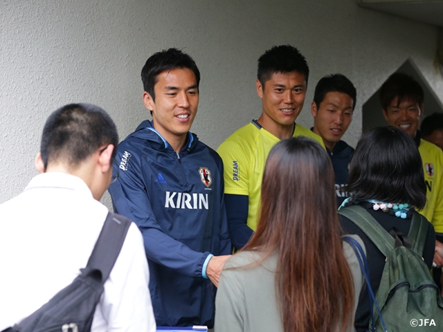 全選手が集まっての活動初日となった5月30日(月)、豊田市運動公園で行うトレーニングの前にハリルホジッチ監督以下25選手が競技場の入口にて、トレーニングの見学に来ていただいたファン、サポーターの皆さんを対象に募金活動を行いました。トレーニング前の実施ということもあり、20分弱の時間となりましたが、200人を超える皆さまからご協力いただき、募金の合計金額は96,901円となりました。