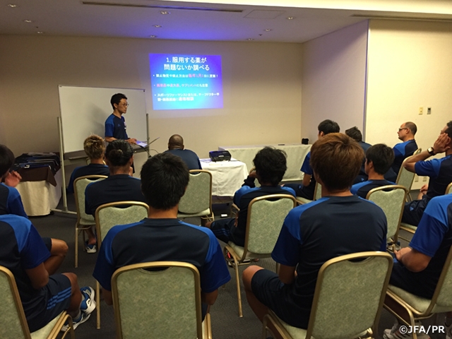 夕食後のミーティングでは、代表チーム帯同の柳澤ドクターが、ドーピングについてのレクチャーを行いました。ビーチサッカー日本代表は、今年9月にアジアンビーチゲームズに出場し、その大会でもドーピング検査が行われます。日本代表選手として戦う前にドーピングに関する知識や心構えを再確認しました。