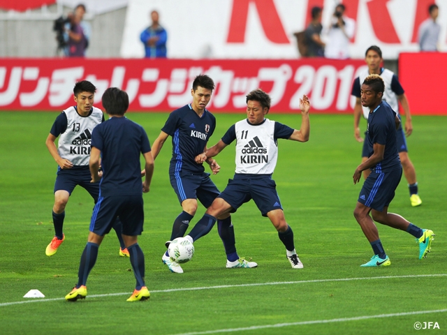 チームはこの日、夕方から試合会場で約1時間の最終調整に臨み、合流が遅れていたDF松原健選手(アルビレックス新潟)も参加。選手たちはフォーメーションやビルドアップの動きを確認し、9対9のミニゲームやシュート練習に精力的に取り組んでいました。左ひじを痛めているMF遠藤航選手(浦和レッズ)はこの日も別メニューでの調整でした。