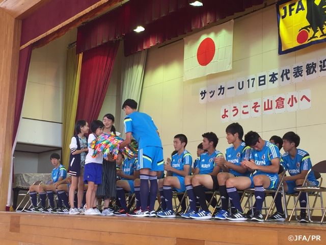 午前のトレーニング後、第1戦のメキシコ戦と第2戦のクロアチア戦が行われる聖籠町にある山倉小学校を訪問し、児童からインタビューを受けたり、応援団からエールをもらいました。代表選手からは、堀研太選手、渡井理己選手がリフティングを披露し、さらに児童との交流試合を行うなど、会場はとても盛り上がりました。
