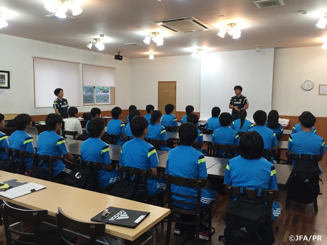 U-17日本女子代表候補は23日(水)、静岡県でトレーニングキャンプを開始しました。雨の降る中、トレーニングの前にまずはミーティングを実施。9月から始まるFIFA U-17女子ワールドカップヨルダン2016を控え、大会前のこの合宿の意味を話す監督の話に、選手たちは真剣な表情を見せていました。