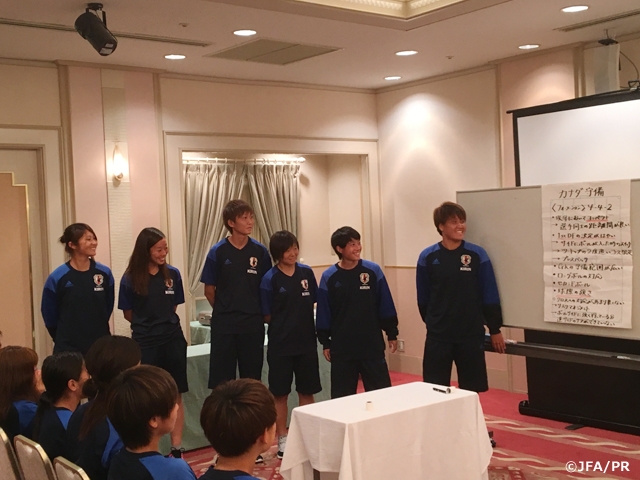 その後、リオデジャネイロオリンピック 女子サッカー 準々決勝のカナダvsフランスの試合映像を全員で見ました。映像を見た後は、両チームの攻撃、守備を分析する4つのチームに分かれ、試合の分析を実施。ゲーム分析をしたことがない選手が大半でしたが、各チームの発表に対して質問をするなど積極的に取り組みました。高倉監督は、「サッカーを理解することで自分自身のプレーも変わってくる。一流のアスリートになるために頭を使って考えよう。」と話し、この日のメニューを締めくくりました。