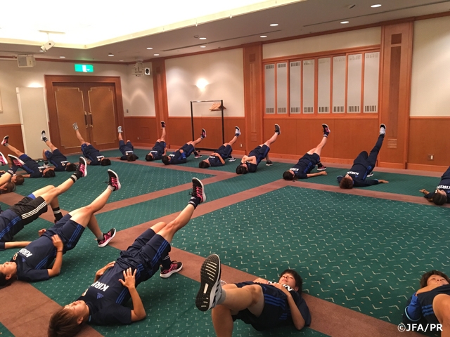 午後は台風の影響により予定していたトレーニングを中止。ホテル内で体幹トレーニングやチューブを使ったトレーニングを行いました。高倉麻子監督は、「日本人選手は海外の選手に比べてフィジカル面がウィークポイント。しっかり個々の強化に取り組んでほしい」と選手たちに伝えました。