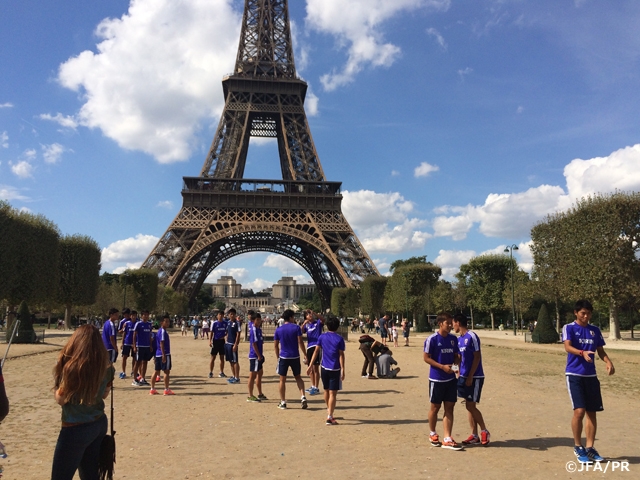 国際親善試合第1戦でU-19フランス代表に勝利したU-19日本代表は1日(木)、第2戦に向けトレーニングを開始しました。第1戦に45分以上出場した選手は、疲労回復のためランニングとストレッチ中心のメニューをこなし、さらに宿舎にてアイスバスを実施しました。その他の選手は、4vs4+フリーマン+ゴールキーパーでの試合形式のトレーニングなどで約1時間、汗を流しました。トレーニング後は、チーム全員でアジア最終予選(Road to Russia) 日本 対 UAEの一戦をテレビ観戦し、観戦後はパリ市内に出掛けて2時間ほど市内観光を行いました。