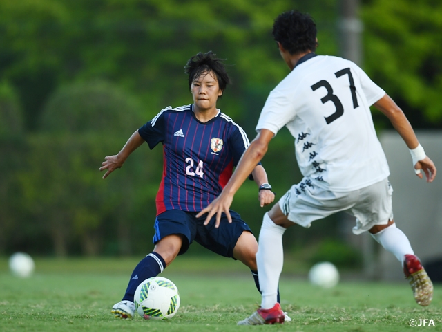 日本女子代表候補は6日(火)、江戸川大学男子チームと練習試合(35分×2本)を行いました。開始5分に日本は最初にコーナーキックを獲得し、短くつないでMF杉田亜未選手が左サイドからクロスボールを上げますが、シュートには繋がりません。その後は相手のフリーキックやコーナーキック、シュートを打たれる時間帯が続きますが、日本は体を張った守備でこの攻撃をしのぎます。
