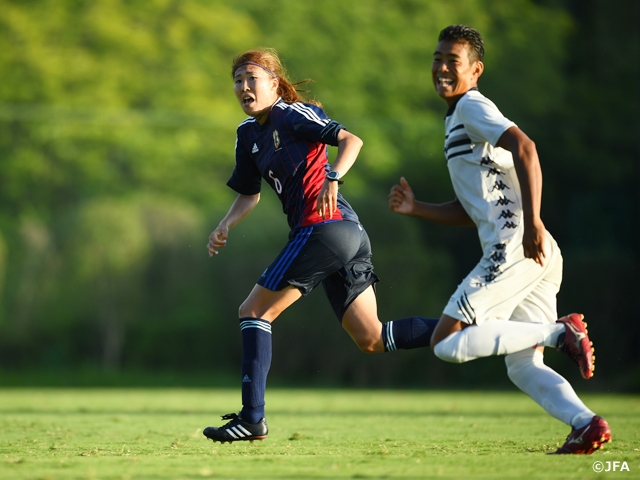 杉田、阪口、有吉佐織の3選手を佐々木繭、中里優、京川舞の各選手に代えて臨んだ後半。日本は徐々に攻撃のリズムを掴み始めます。開始早々、上尾野辺めぐみ選手のスルーパスを受けた増矢選手がペナルティエリア右からシュート、44分には同位置から中島選手がシュートを放ち、いずれも相手GKにセーブされてしまいますが、徐々にボールを保持する時間帯が増えていきます。46分にはセンターサークル付近で相手ボールを奪取した中里選手がドリブルで中央を駆け上がり、増矢選手にパス。しかし増矢選手のシュートは相手GKが正面でキャッチし、得点にはなりません。体格の一回り大きな男子大学生相手に日本は必死に食らいつきますが、その後得点を許し、0-4でトレーニングマッチを終えました。