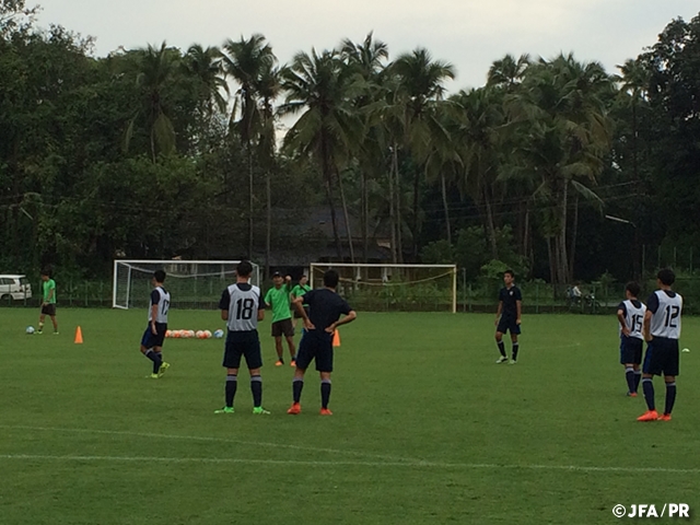 翌日のグループステージ第2戦vs.U-16キルギス代表に向け、試合を想定した紅白戦を中心に約1時間30分トレーニングを実施。森山佳朗監督は、紅白戦中に時折プレーを止め、一つ一つの細かなプレーの修正、セットプレーの確認等を随所で行いました。ホテルでのミーティングでは選手たちに対し「勝って兜の緒を締めよ」と伝え、第一戦での大差での勝利に満足することなく、引き続き集中して大会に挑むよう選手たちに伝えました。