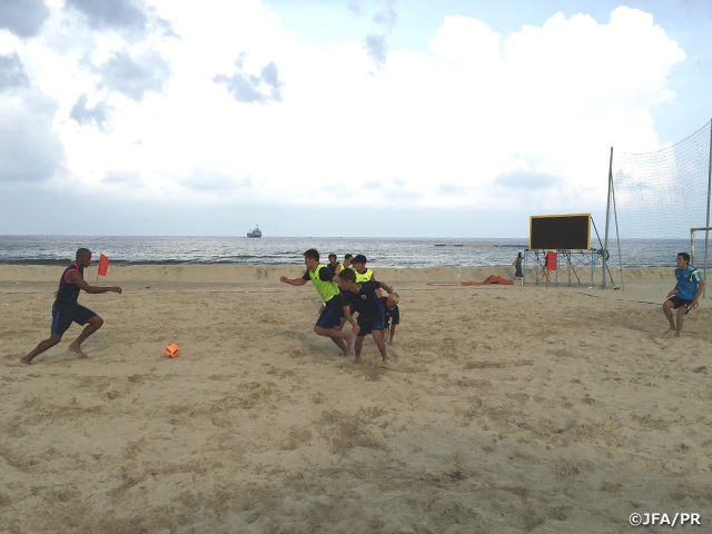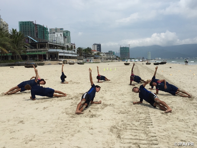 翌20日(火)の午前は、強い日差しが照りつけ、気温も30度以上と高い中、ホテルの近くのビーチに行き、ランニングやフットバレーといった軽めのトレーニングを行い、コンディションを整えました。