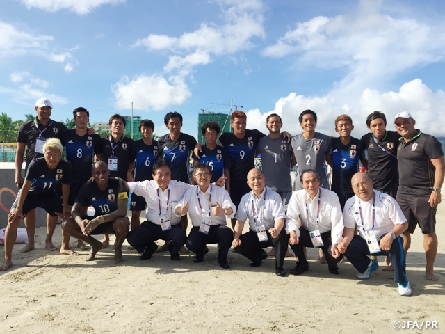 その総会終了後にビーチサッカー日本代表の応援にご来場いただき、試合終了後には一緒に記念撮影をして、選手、スタッフを激励されました。