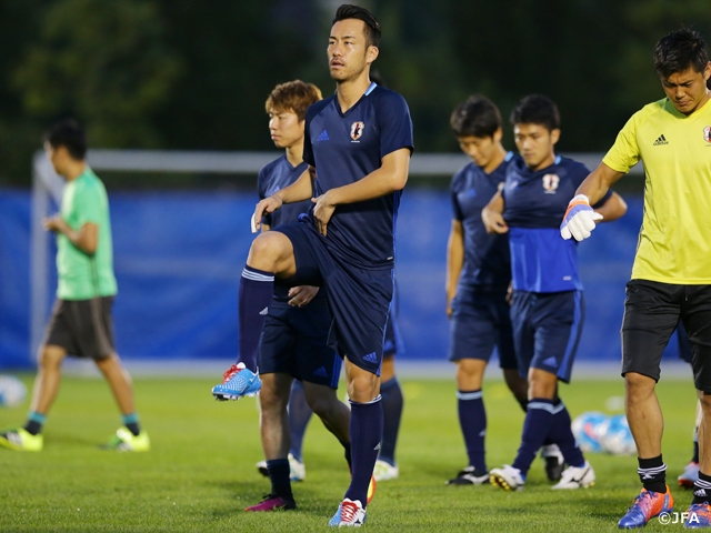 昨夜到着した岡崎選手、DF酒井宏樹選手(オリンピック・マルセイユ)、DF吉田麻也選手(サウサンプトン)は午前中に体を動かして夕方の練習に参加。他のメンバーと共にランニングや体操などをこなしましたが、この日の朝、成田空港に降り立った本田選手とDF長友佑都選手(インテル・ミラン)は別メニューで軽めの調整でした。