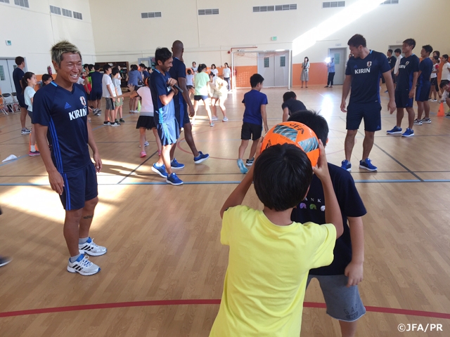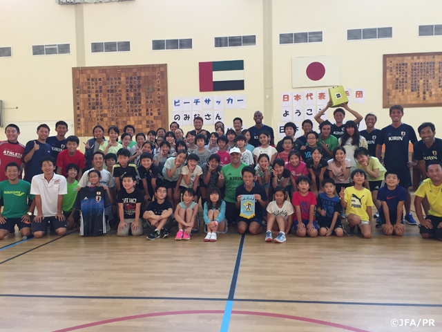 また本日のトレーニング前、チーム全員でドバイの日本人学校を訪問しました。学校の子どもたちの温かい歓迎で迎えられた選手たちは、早速サッカー交流を行いました。メニューごとにコーチ役の選手が変わり、ユーモアあふれるメニューで選手、子どもたち共にサッカーを楽しみました。また、選手たちはビーチサッカーの醍醐味であるオーバーヘッドシュートのデモンストレーションで会場を沸かせました。最後には、学年ごとのチームと選手に分かれて試合を行いました。時折マルセロ監督や選手が子どものチームに加わり、ゴールを決めた場面ではとても盛り上がり、子どもたちの笑顔を多く見ることができました。選手たちは長い遠征の疲れを子どもたちの笑顔でリフレッシュできた様子でした。