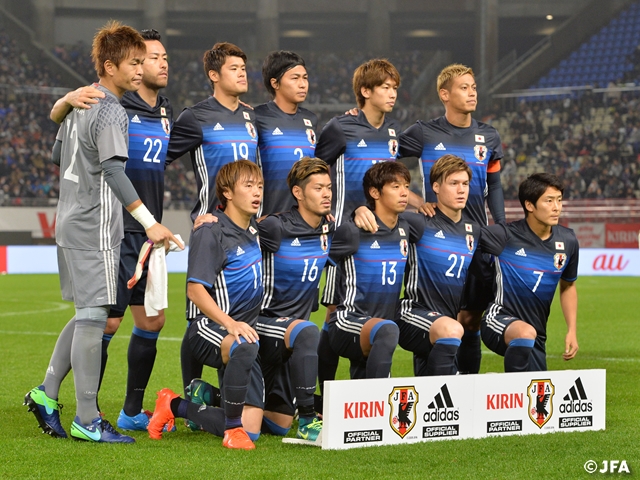 試合前日の会見でヴァイッド・ハリルホジッチ監督が「出場機会の少ない選手を起用してクオリティが見たい」と話していたとおり、ここまで先発だった選手たちの一部に変えて、前線に約1年半ぶりに代表復帰した大迫選手、左FWに斎藤学選手(横浜F・マリノス)を起用。中盤の底にはこの日が代表デビューとなったMF永木亮太選手(鹿島アントラーズ)、最終ライン中央にはDF丸山祐市選手(FC東京)を配して臨みました。