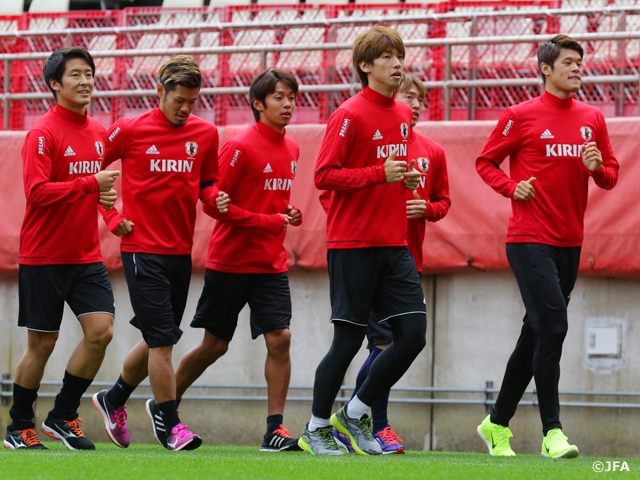 前日の試合で、1年半ぶりの復帰戦で2得点をマークしたFW大迫勇也選手(1.FCケルン)や3得点に絡む活躍を見せたMF清武弘嗣選手(セビージャ)ら先発組はランニングやストレッチ、体感トレーニングなどでリカバリーに務めました。
