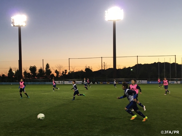 日本女子代表候補は12月6日(火)、静岡市内でのトレーニングキャンプ2日目を迎えました。天候にも恵まれ、快晴のなか二部練習を実施。午前中はフィジカルを意識したトレーニングから始まり、ポゼッション、シュート練習に続いて、7対7+フリーマンのゲームを行いました。午後はウォーミングアップに続いて4対4、ロングパスとヘディング練習を行ったあと、ゲーム形式の練習で締めくくりました。高倉監督は「ファーストディフェンスをしっかり行い、パスの精度にもこだわってほしい」と選手たちへ伝えました。