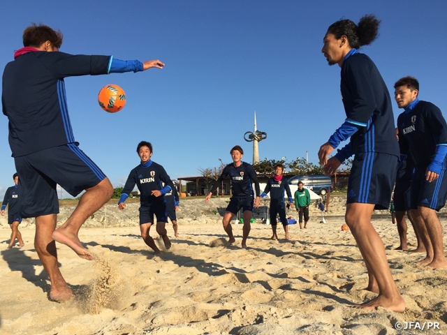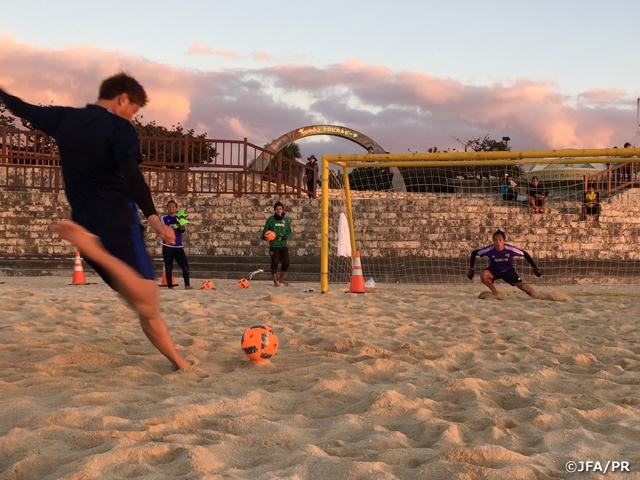沖縄で実施されているビーチサッカー日本代表候補トレーニングキャンプは12月17日(土)に合宿2日目を迎え、この日は午前と午後の2部練習を行いました。