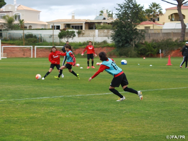 FPFアルガルベカップ2017アイスランド戦の勝利から一夜明けたなでしこジャパンは3月4日(土)、前日の先発組とサブ組に分かれてトレーニングを行った後、午後は休息に時間を充てました。翌5日(日)は、午後から全体でトレーニングを実施。7対7+2フリーマンや8対8のポゼッション、10対9のゲーム形式のメニューで戦術を確認し、約1時間半汗を流しました。