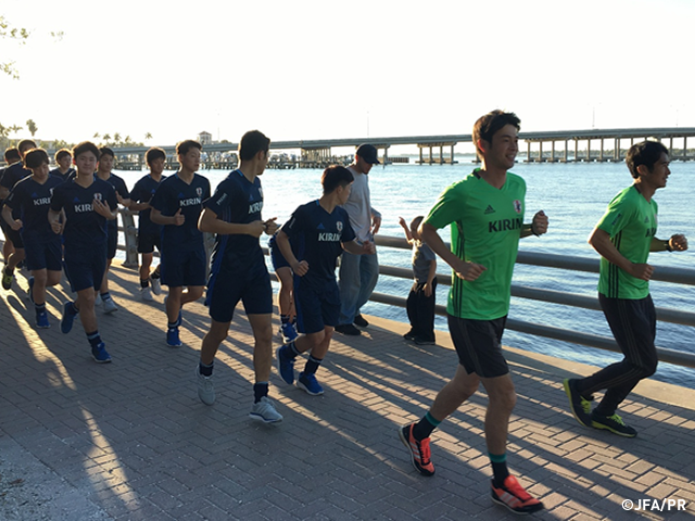 「00ジャパン」は17日(金)、乗り換えを含め19時間をかけて、遠征先となるアメリカ・タンパに到着しました。この場所は2014年にSAMURAI BLUE(日本代表)がFIFAワールドカップブラジル2014直前にキャンプを行った地です。現地到着後は、中馬健太郎コンデションコーチのもと、時差対策とリフレッシュを兼ねて1時間ほどランニングを実施しました。