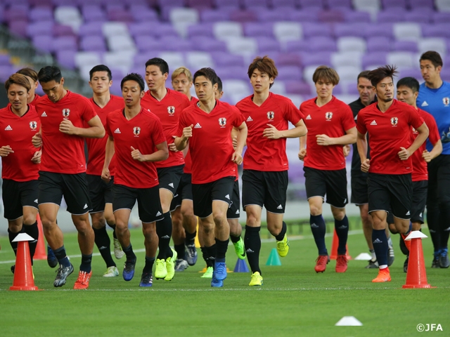湿度が低くカラッとした気候の中、MF香川真司選手(ボルシア・ドルトムント)、DF吉田麻也選手(サウサンプトン)らがランニングや体操で体を動かし、ピッチの感触を確かめました。その後の非公開での練習では、限られた時間の中、戦術の最終確認を入念に行いました。なお、MF高萩洋次郎選手(FC東京)は右足親指の痛みのため、ホテルで別調整でした。