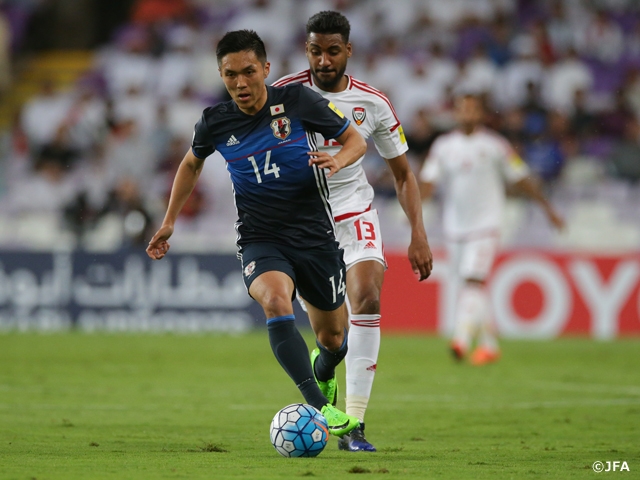 昨年9月のホームでの最終予選初戦では日本が1-2と敗れた相手に、日本は立ち上がりから高い集中力と素早い攻守の切り替えで、UAEの攻撃の芽を摘む一方、積極的に攻撃を仕掛けて試合を進めます。