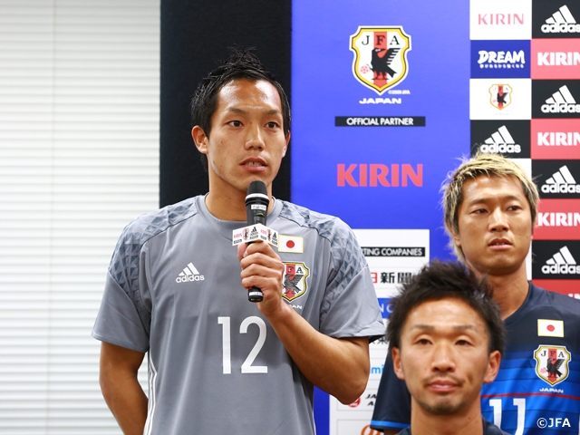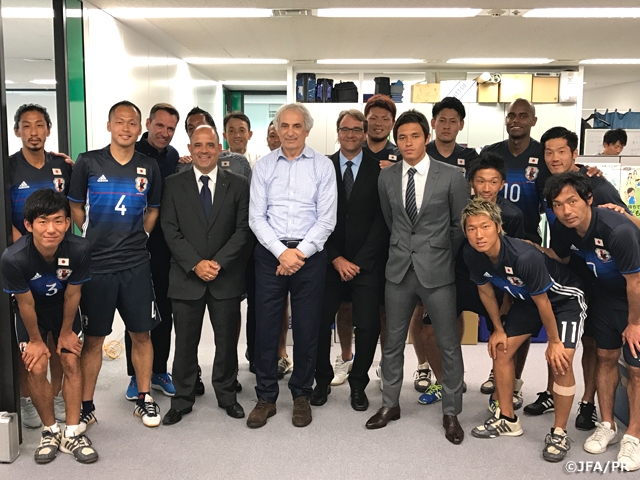 記者発表後には、チーム全員がJFA職員の働くオフィスへあいさつにまわり、ちょうどJFAハウスで執務中だったヴァイッド・ハリルホジッチ監督らSAMURAI BLUEのスタッフともお互いの健闘を誓い合い、来る世界との戦いに向けて、選手たちは気持ちを引き締め直していました。