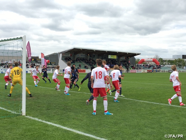 U-16日本代表は17日(月)、フランス遠征「モンテギュー国際大会」の3位決定戦でU-16デンマーク代表と対戦し、2‐1で勝利しました。U-16デンマーク代表は、準決勝で惜しくもU-16フランス代表に敗れましたが、グループリーグでU-16ブラジル代表、U-16モロッコ代表に2連勝した強豪チームです。