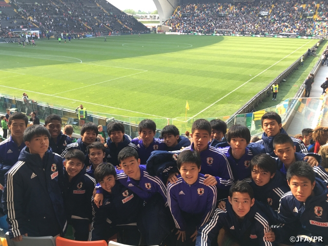 遠征3日目の4月23日(日)は、午前のみトレーニングを実施。20分間の有酸素運動を行った後、パス&コントロール等のメニューをこなしました。イタリアでの最初のトレーニングは、約1時間20分という短い時間でしたが、チーム全体で集中して取り組みました。午後は、大会から招待されて、イタリアセリエA ウディネーゼのホームスタジアムを訪問。同会場で行われた、イタリアセリエA ウディネーゼ 対 カリアリの試合をチーム全員で観戦しました。