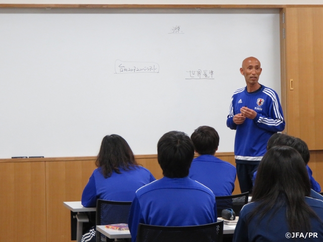 初日となったこの日は週末に各所属チームでリーグ戦に出場した選手が多く、選手たちのコンディションを考慮し、軽めの調整となりました。ボールフィーリングから始まり、3対1のボール回し、ヘディングシュート、そして最後に8対8のミニゲームを行い、1時間強の練習を終えました。トレーニング中、望月監督から選手達には「試合と同じようにプレーすること」、「世界基準でプレーすること」が要求され、最後に行われたミニゲームでは、それらを意識したプレーが見られました。また、夜に行われたミーティングでは「世界基準とは何か」を選手たちが考え、改めて目標である「優勝」を実現するために必要なことをチームで再確認しました。