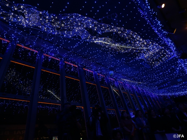 その幻想的なイルミネーションに包まれながら、無事点灯式が終了。点灯式が終わった後も、イルミネーションやSAMURAI BLUEのバナーを背景に記念撮影をするなど多くの方で賑わっていました。