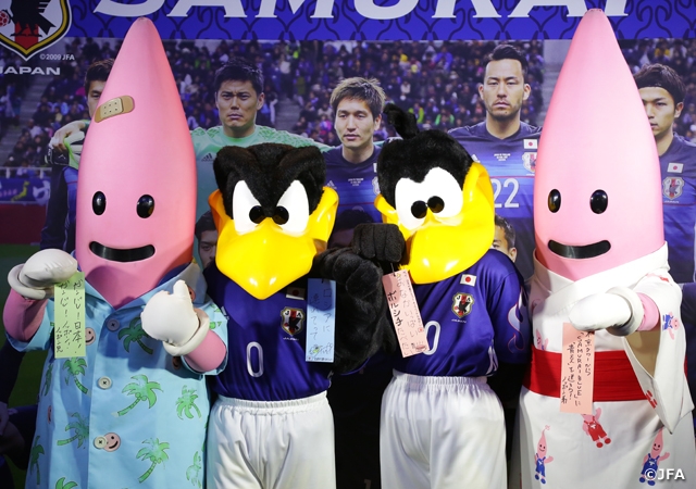 点灯式に先立ち、SAMURAI BLUEの集合写真を使用したバナーを背景に、6月7日(水)に日本代表選手が着用するメモリアルユニフォームに着替えた日本代表公式マスコットのカラッペとカララが、東京タワーイメージキャラクターのノッポン兄弟と登場し、夢のコラボが実現。100人を超える来場者が集まった会場を盛り上げました。
