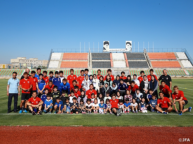 練習開始前には、テヘラン日本人学校の児童を中心に約50人の子どもたちとピッチで記念撮影に臨み、撮影後、子供たちは選手たちから記念のペナントを受け取っていました。