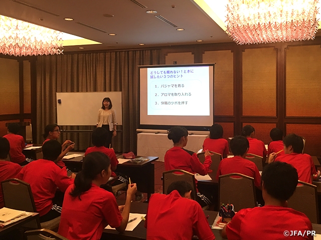 夕食後には、日本代表プロバイダーの西川産業株式会社による睡眠レクチャーが行われ、アスリートのパフォーマンス向上のために必要な食事や運動に加えて、寝る前にしてはいけないことや、正しい枕の当て方等、睡眠の重要性について指導を受けました。レクチャー終了後には選手から積極的に質問が上がり、実りあるキャンプ初日となりました。
