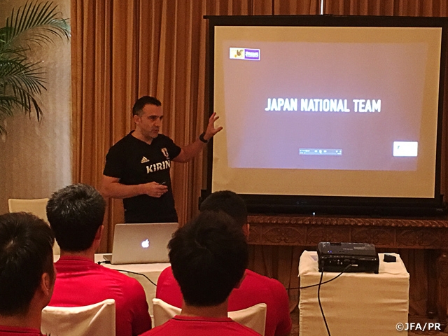 トレーニング開始前に滞在先のホテルにて約1時間のビデオミーティングを行い、練習会場に向かいます。キャンプ3日間とも、トレーニング開始前にこうしてビデオミーティングを行い、視覚を用いて戦術理解度を向上させ、ピッチで実戦を重ねていきました。そうすることで選手間での動き方も自動化し、選手たちも日々積み重ねていく戦術の引き出しを持った上でプレーに臨むことができています。
