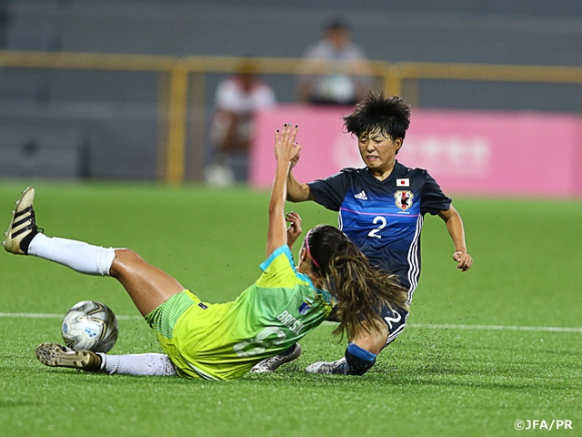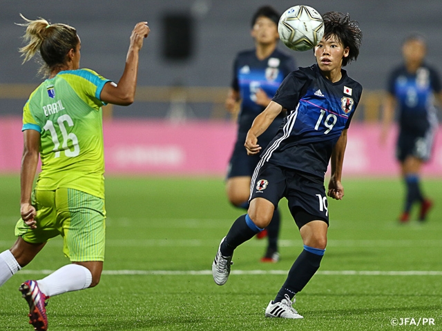 試合は、開始早々からブラジルが前線からのプレッシングと攻守の切り替えの早さでボールを保持し、優位に進めます。日本女子代表は粘り強い守備から攻撃へと糸口を掴みたいところですが、パスがずれたり判断が遅くなったりし、自分たちのリズムで試合をさせてもらえず、ブラジルのフィジカルや身のこなしの上手さになかなかボールを保持することができません。果敢にゴールを奪いにかかりますが、GKのファインセーブもあり得点には至らず、前半はスコアレスで終えます。