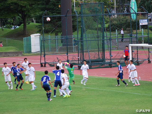 15分に相手の細かいコンビネーションからミドルシュートを打たれますが、GK山田大樹選手のセーブで先制点を許さず。さらに27分には自陣の左サイドを突破され、決定的なシュートを打たれますが、枠を外れ、難を逃れます。悪い流れが続くと思われた38分、テンポの良いポゼッションでボールを保持し、右サイドから速いクロスを上げ、ゴール前の混戦の中、青島健大選手が相手のクリアボールにつめて、体に当たり跳ね返ったボールがそのままゴールに入り、先制点を上げます。