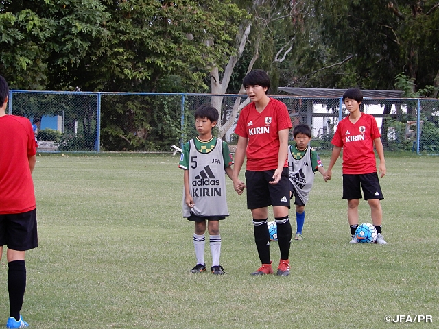 翌16日(土)は、午前中に学校の課題や勉強を行い、午後は攻撃を中心としたトレーニングを行った後、地元の日本人学校に通う小学1年生~6年生と4チームに分かれてミニゲーム、小学生チーム対U-16日本女子代表とのミニゲーム対決を行う交流会で、終始リラックスした雰囲気で終えました。