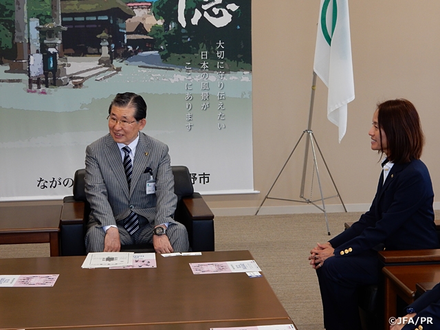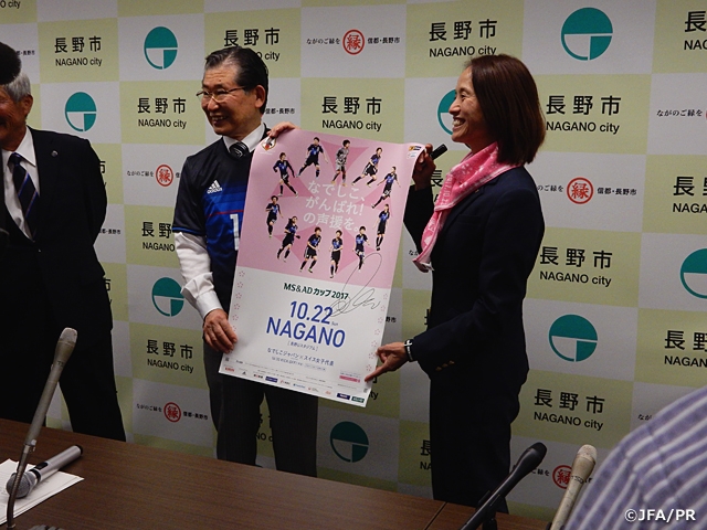 なでしこジャパン(日本女子代表)の高倉麻子監督が9月27日(水)、MS&ADカップ2017(10月22日(日)@長野Uスタジアム)が開催される長野市の加藤久雄市長を表敬訪問しました。