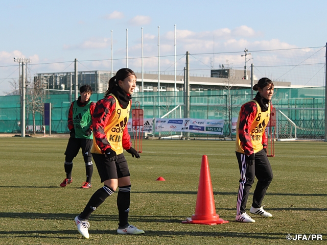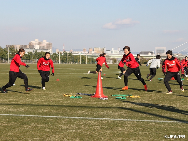 浮き彫りになった課題を前にして、午後のトレーニング前に行われたミーティングで高倉麻子監督は選手に意見を求めると、多くの選手から手が挙がりました。高倉監督は「戦う姿勢は素晴らしかった。全てはひとつひとつの積み重ね。課題を持って取り組んでいけば必ず成長できる」と話し、「ピッチ上でのオンとオフ、特に、格上の相手と戦う時はオフの時間が大事になる。ポジショニング、準備、予測、駆け引き、そうした細かな部分の精度を上げていこう」と伝え、選手たちをトレーニングに送り出しました。