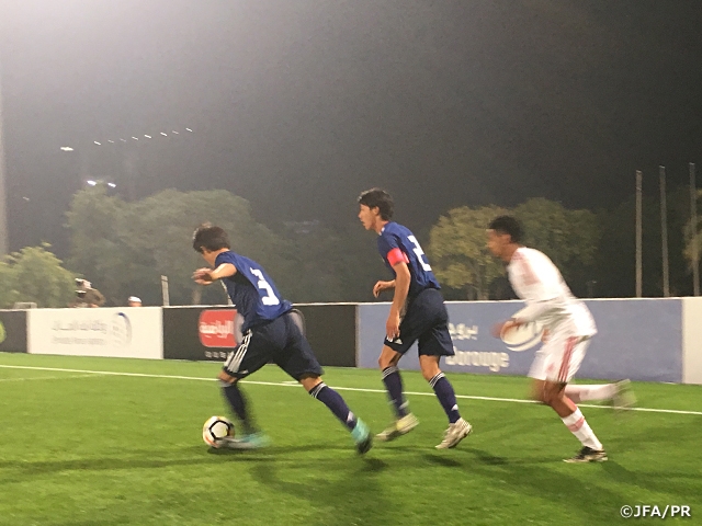 前半は、ボールを奪ったらまず前線に早いフィードをして速攻を狙うUAEに対して、課題であるディフェンスラインのコントロールをキャプテンのDF半田陸選手を中心に上手く機能させて対応し、決定的な機会を与えません。攻撃面では中盤でパスが回るようになり、何度か得点機会が訪れますがゴールネットを揺らすまでには至らず、0-0のスコアスレドローで折り返します。