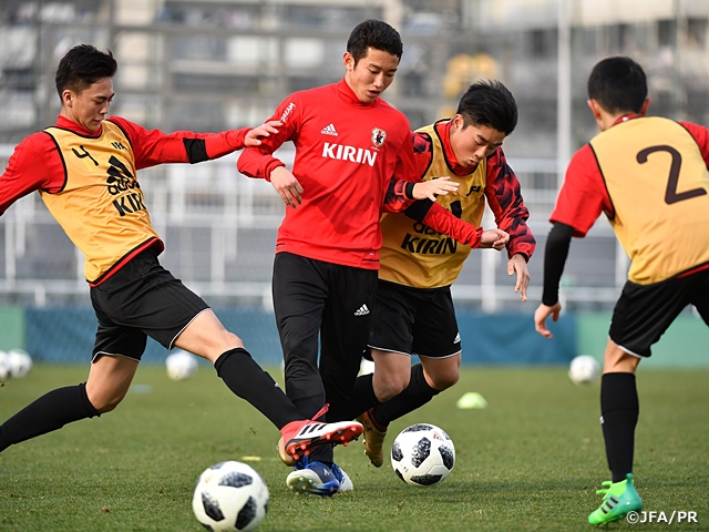 遠征4日目、トレーニングマッチを前日に控えた22日(木)は午前・午後の2部トレーニングを実施しました。気温も昨日より低く2℃とみぞれが降る厳しい環境でしたが、森山佳郎監督から「皆で盛り上げて明るくいこう」と声をかけられ、トレーニングを開始しました。4対4対3フリーマンからスタートするとGKを入れて3対2、5対4で昨日は守備面を強化しましたが、午前は攻撃面を意識して取り組みました。常に相手を観察し、空いているスペースを探し、動きながらのプレーの質や判断を選手らは求められていきます。午後はより連携面を意識したトレーニングを実践的に行いました。フルコートでGKからビルドアップしていきシュートまでの流れを全員で共有しました。全体の距離感、バランスを意識し、ボールを動かしタイミング良く前線へ縦パスを送り、次々と選手が飛び出してくるイメージを皆で考え、判断し、実践的にトライしていきました。