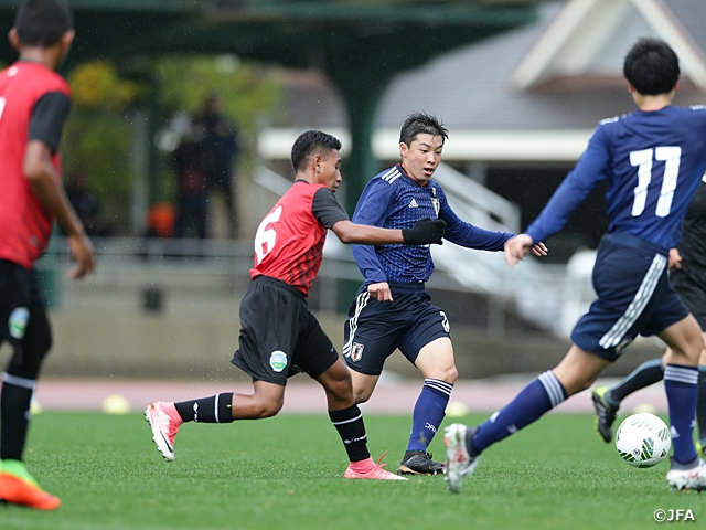 試合は序盤から日本が相手を圧倒します。2分、スルーパスで抜け出したFW真家英嵩選手が相手GKをかわして冷静に流し込み、幸先良く先制点を奪います。雨の影響で濡れたピッチの為、日本は素早くパス交換し、サイドから何度も仕掛け、ゴールを次々に奪っていきます。12分、MF中村尚輝選手がゴール前で強引にシュートを放ち2点目。13分には、相手のクリアミスを誘い、そのプレーで抜け出した中村選手が相手GKをもかわして3点目。攻撃の手を緩めない日本は、ゲームキャプテンを務めたDF石井玲於奈選手の鋭い縦パスに反応したMF屋敷優成選手が右サイドを駆け上がり、クロスは一度相手DFにクリアされますが、再びクロスを上げると、それを中村選手が合わせて4点目。21分には、屋敷選手のシュートがポストを直撃し、その跳ね返りを真家選手が押し込み5点目。22分には、中村選手のシュートが相手DFに当たって入り6点目。前半終了間際にも、クロスをMF東廉選手が冷静に決めて、日本は前半だけで7点のリードを奪い折り返します。