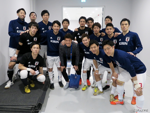 欧州遠征中のフットサル日本代表は4月3日(火)、ARENA DU PAYS D'AIX(フランス/エクス・アン・プロヴァンス)にてフットサルフランス代表との国際親善試合を行いました。試合開始前には現在オリンピック マルセイユ(フランス)で活躍する酒井宏樹選手がフットサル日本代表の激励に訪れました。